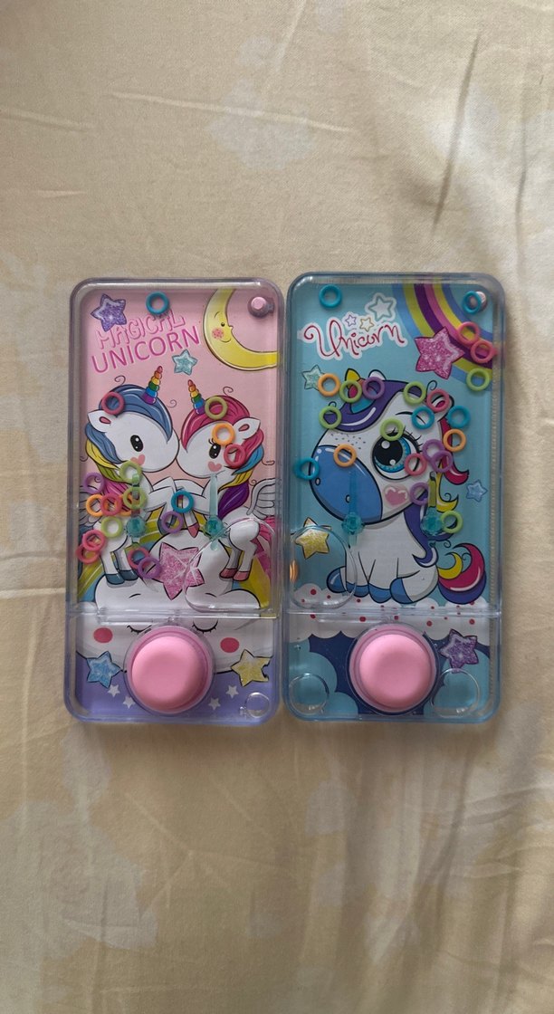Pastel renklerde unicorn temalı, düğmeye basılarak halkaların yakalandığı iki su oyunu. Çocuklar için eğlenceli ve renkli oyuncak.