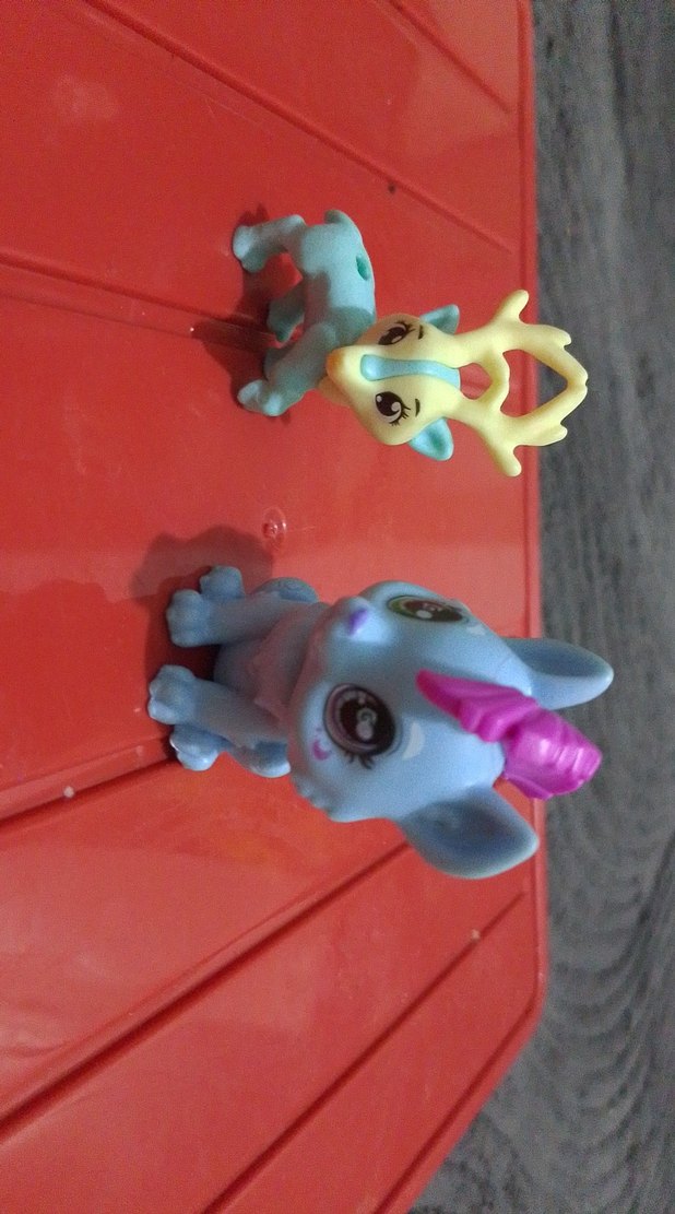 Mavi unicorn ve sarı geyik figürleri, büyük gözlere sahip renkli oyuncaklardır.mavi oyuncağın kafası dönüyor