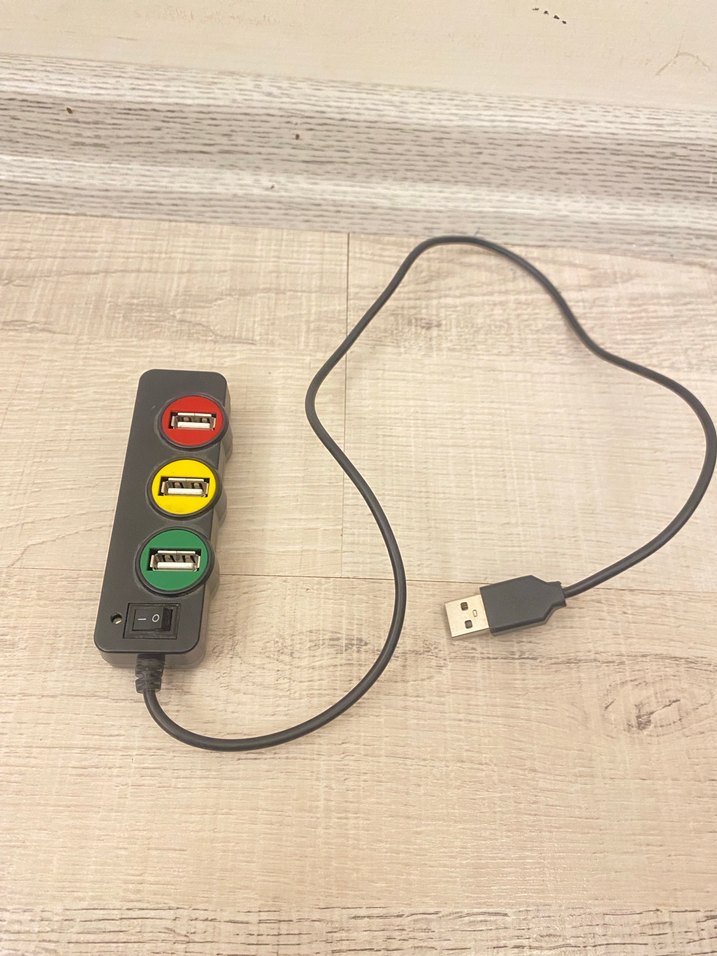 Koyu renkli, üç portlu ve açma/kapama düğmeli USB hub. USB kablosuyla bağlantı sağlar.