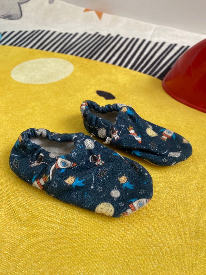 Renkli uzay desenli, velcro bantlı ve kauçuk tabanlı erkek bebek patiği. Bohem ve retro tarzda. 21 numara ama kalıp küçük 19-20 olur