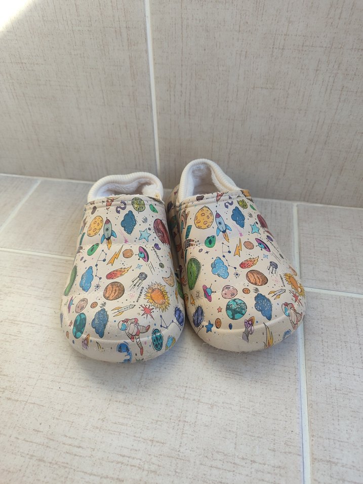 Renkli uzay temalı desenlere sahip, cırt cırtlı ve kauçuk tabanlı erkek çocuk sıcak terliği. 32,33 numaraya uyumlu