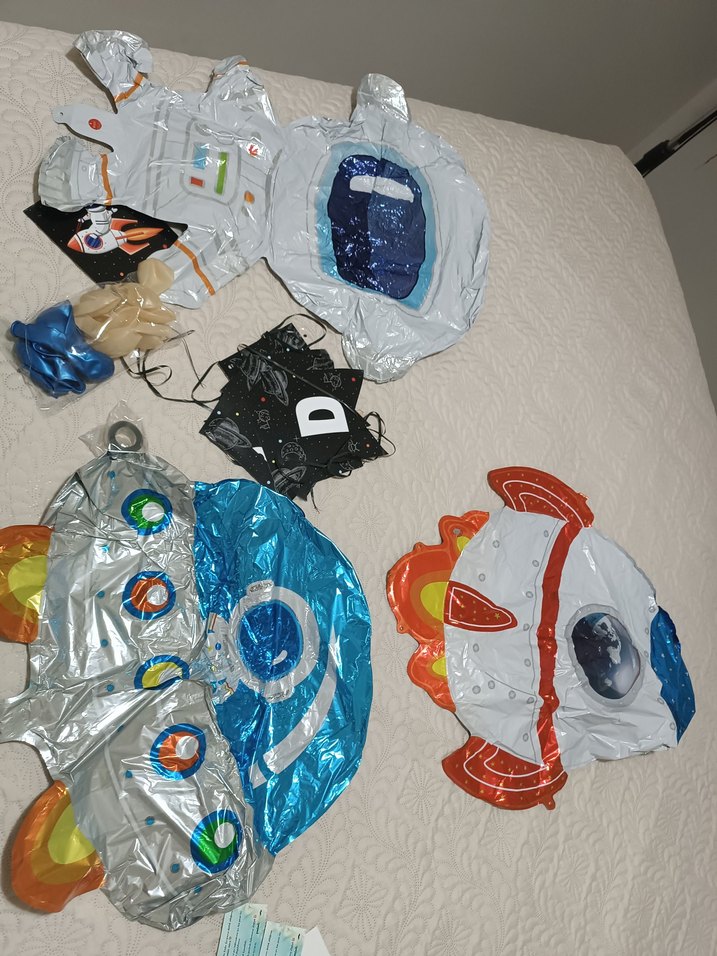 Parlak malzemeden yapılmış, roket ve uzay gemisi şeklinde renkli uzay temalı balon seti. 2 yaş balonu hariçtir 5 adet mavi parlak balon 7 adet şeffaf balon ve 2 yaş pasta süsü mevcuttur sadece bir kere kullanıldı fotoğraf çekmek için figürler ağızla değil pipetle şişirildi.