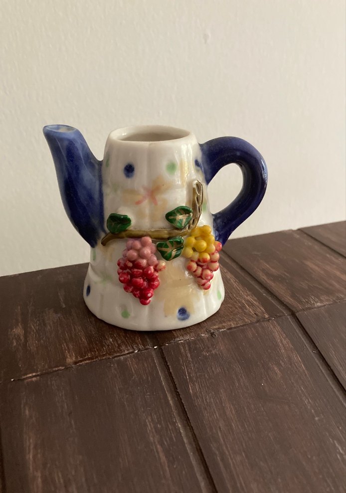 Bu küçük seramik demlik, beyaz zemin üzerine renkli üzüm desenleri ve koyu mavi sap ile ağızlığa sahiptir.