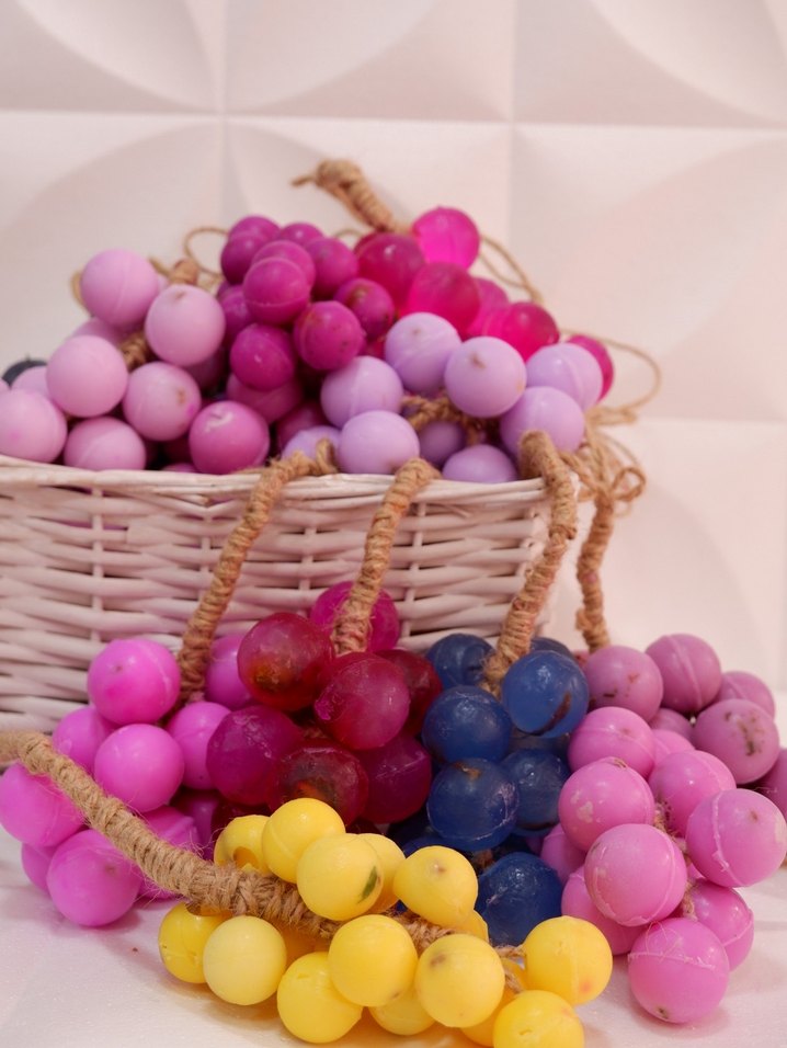 Çeşitli renklerde üzüm şeklinde sabunlar, doğal ip askıları ile kolayca asılabilir. Dilediğiniz renk koku ve doğal yağlarla üretilir  İçeriğinde sabun gazi badem yağı ve seçeceğiniz ürüne göre lavanta gül papatya yağı portakal yağı tarçın Türk kahvesi bebek pudrası eklenebilir