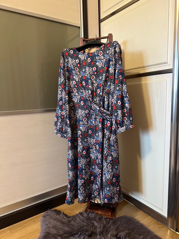 Renkli uzun elbise, bol kesim, uzun kollu ve yuvarlak yaka. Dökümlü tasarım ve canlı batik desenli, yumuşak sentetik kumaştan yapılmıştır. Bohem tarz için uygun.