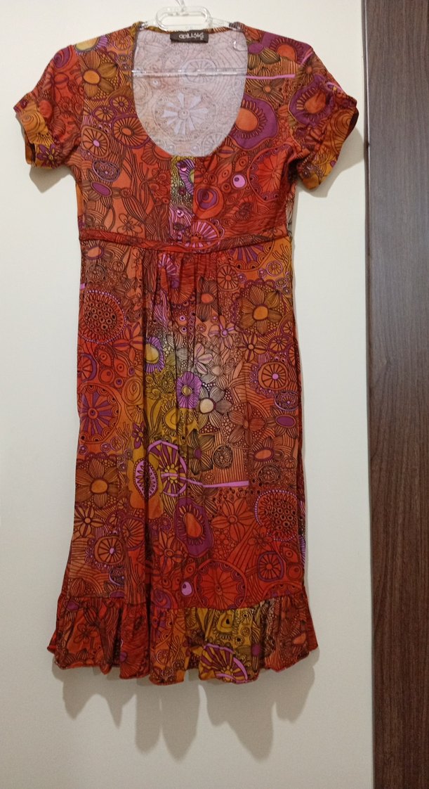 Renkli, bol kesim bohem elbise, kısa kollu, tekne yakalı ve düğmeli ön detaylara sahiptir. Canlı batik desenli, uzun ve fırfırlı eteklidir.