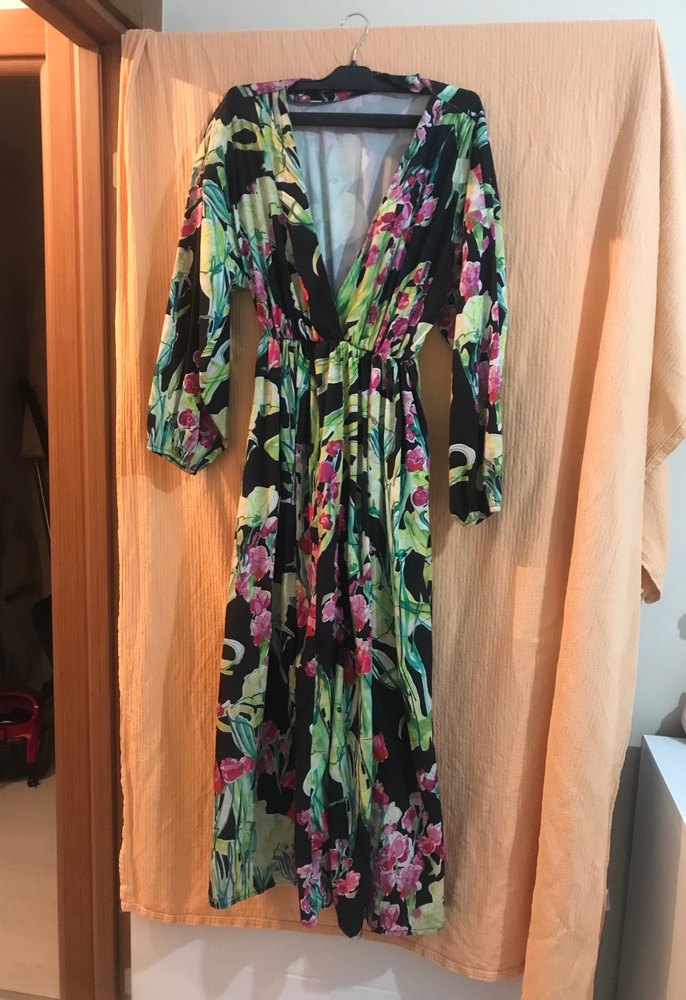 Renkli tie-dye desenli, bol kesim ve drapeli uzun elbise. Yumuşak sentetik kumaştan, uzun kollu ve V yakalı bohem tarzda.