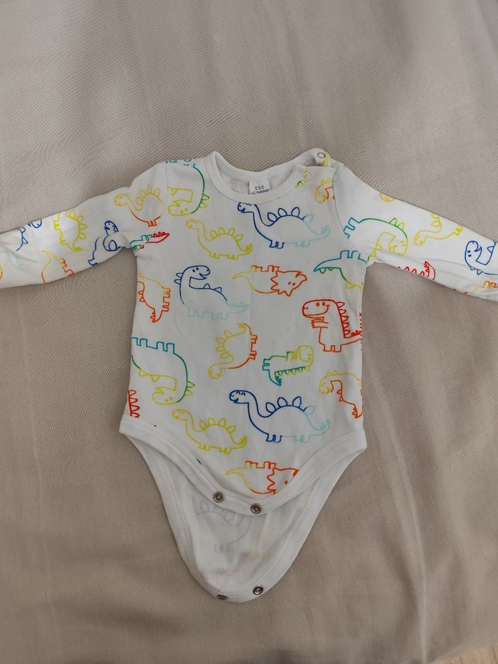 Renkli uzun kollu, yuvarlak yaka ve düğmeli bebek body, eğlenceli dinozor desenleriyle.
