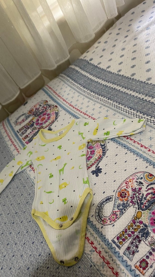 Renkli, uzun kollu, boğazlı ve örgü dokulu bebek body. Canlı batik desenli, yumuşak sentetik kumaştan, sokak stiline uygun.hiç kullanılmadı temizdir
