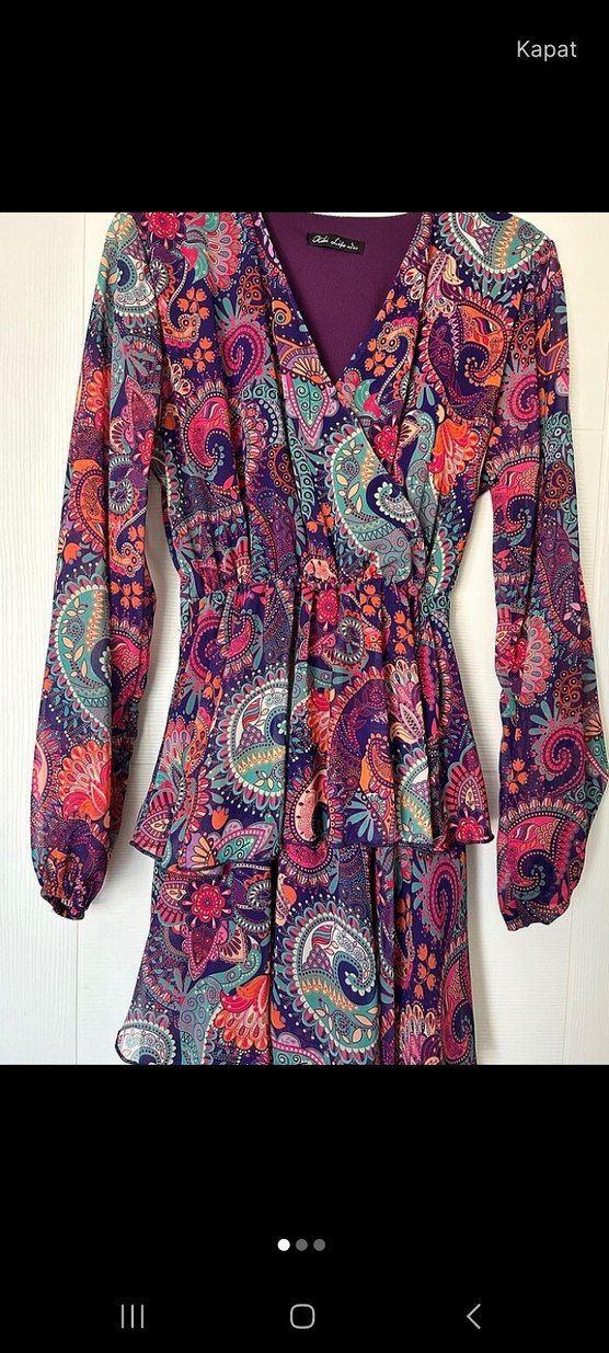 Renkli bohem desenli, uzun kollu, bol kesim elbise. Sentetik kumaştan, V yaka ve fırfır detaylı, günlük kullanım için uygun.