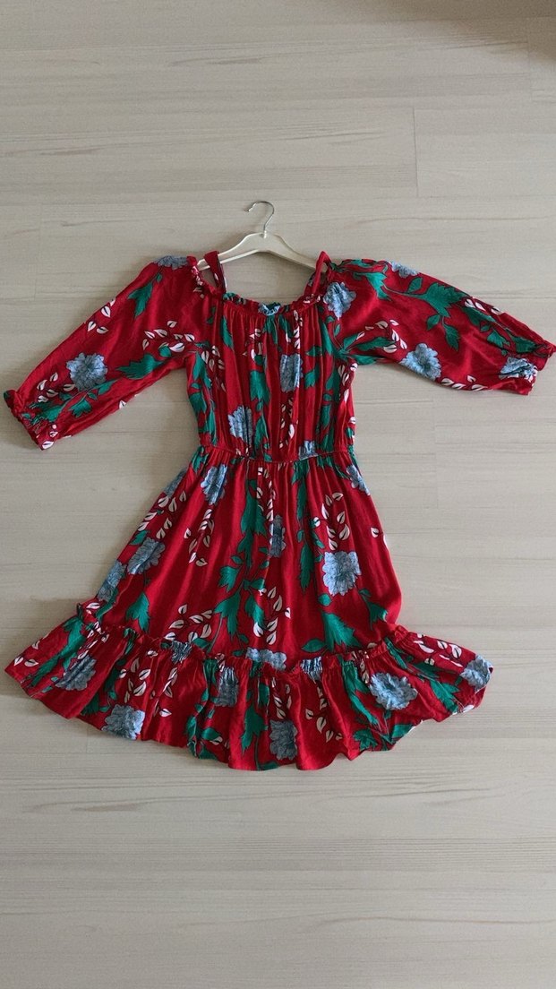Renkli, uzun kollu, tekne yaka ve bol kesim bohem elbisedir. Fırfır detayları ve batik desenleriyle canlı bir görünüm sunar.