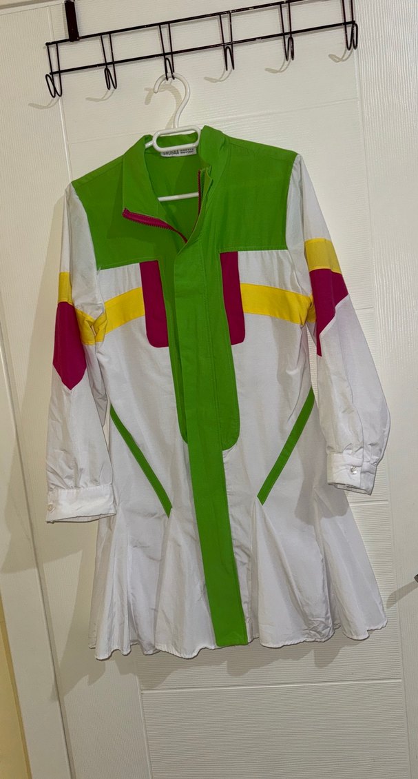 uzun kollu, hakim yakalı, bol kesim kadın gömleği. Canlı çok renkli pop kültür baskısına sahip, günlük kullanıma uygun.