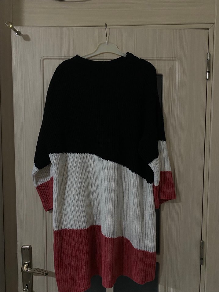 Uzun kollu, bol kesim kadın kazak, yuvarlak yaka ve rahat örgü kumaştan üretilmiştir. Koyu ve çok renkli blok desenlidir, günlük rahat sokak stiline uygundur.