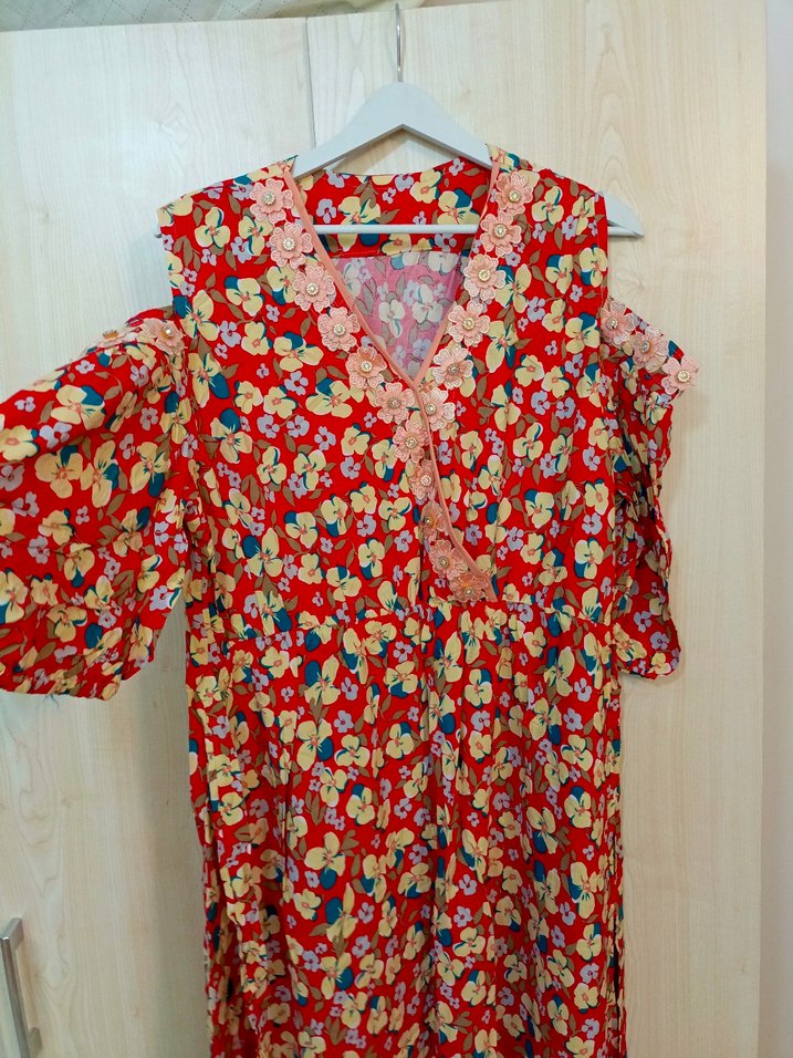 renkli uzun omuz detaylı elbise
