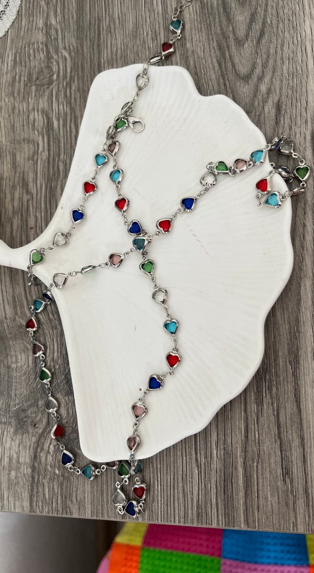 Renkli kalp şeklinde işleme detaylı uzun zincirli bohem tarzda kadın kolye, günlük kullanıma uygundur.