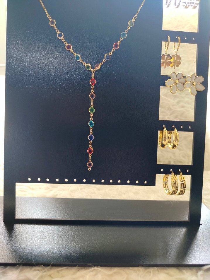 Renkli taşlarla süslenmiş, uzun zincir detaylı bohem tarzı kolye, romantik buluşmalar için uygun.
