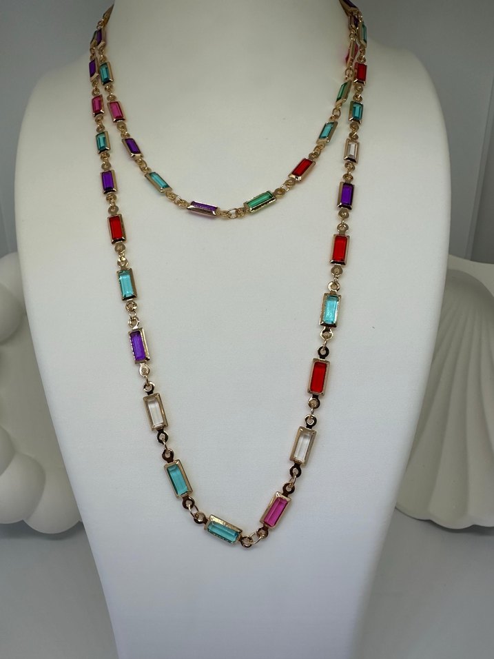 Renkli dikdörtgen taşlar ve detaylı zincirden oluşan uzun kadın kolyesi, bohem ve ışıltılı tarzı tamamlar.