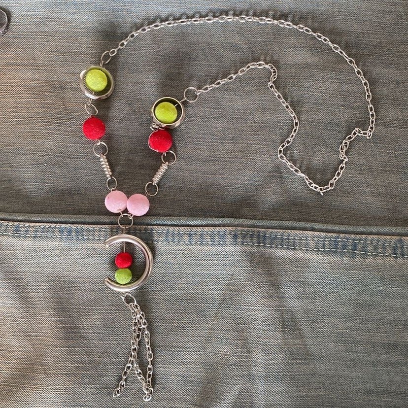 Renkli puantiyeli boncuklarla süslenmiş uzun zincir detaylı, bohem ve avangart stile uygun günlük kullanıma uygun kolye.