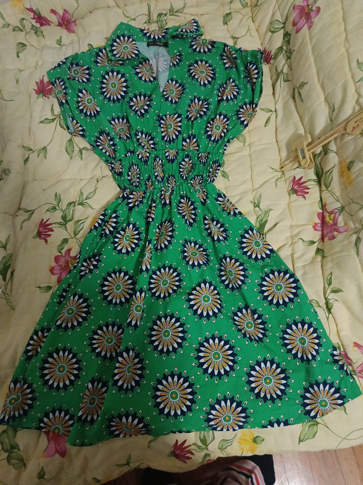 Uzun, renkli çiçek desenli, kısa kollu ve V yakalı bohem tarzda, bele oturan elbise. Fırfır detayları ve bel lastiği bulunur.