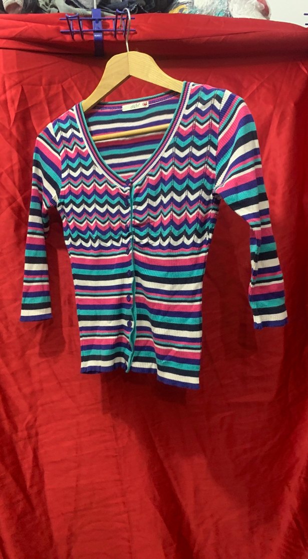 Renkli örgü kumaştan, V yaka ve uzun kollu, bohem ve retro tarzda, günlük kullanım için ideal, dar kesim kadın kazak.