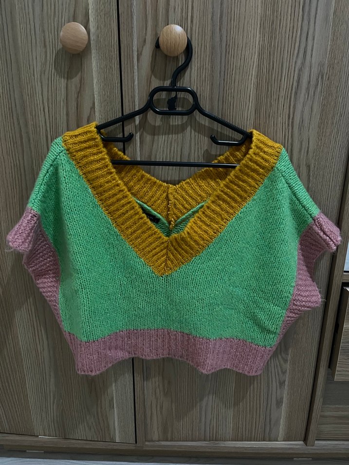 Örgü, rahat ve yumuşak kumaştan yapılmış, bol kesim, V-yaka, kolsuz kadın süveter. Pastel tonlarda yeşil, pembe ve hardal renkleriyle bohem tarzda kısa boyda.