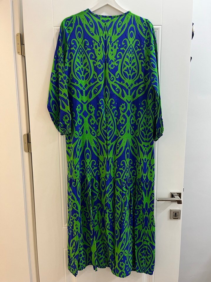 Renkli yeşil ve mavi desenli, V yaka uzun kollu bilekleri lastikli, salaş kesimli, dökümlü uzun elbise. İyi durumda temiz kullanıldı.