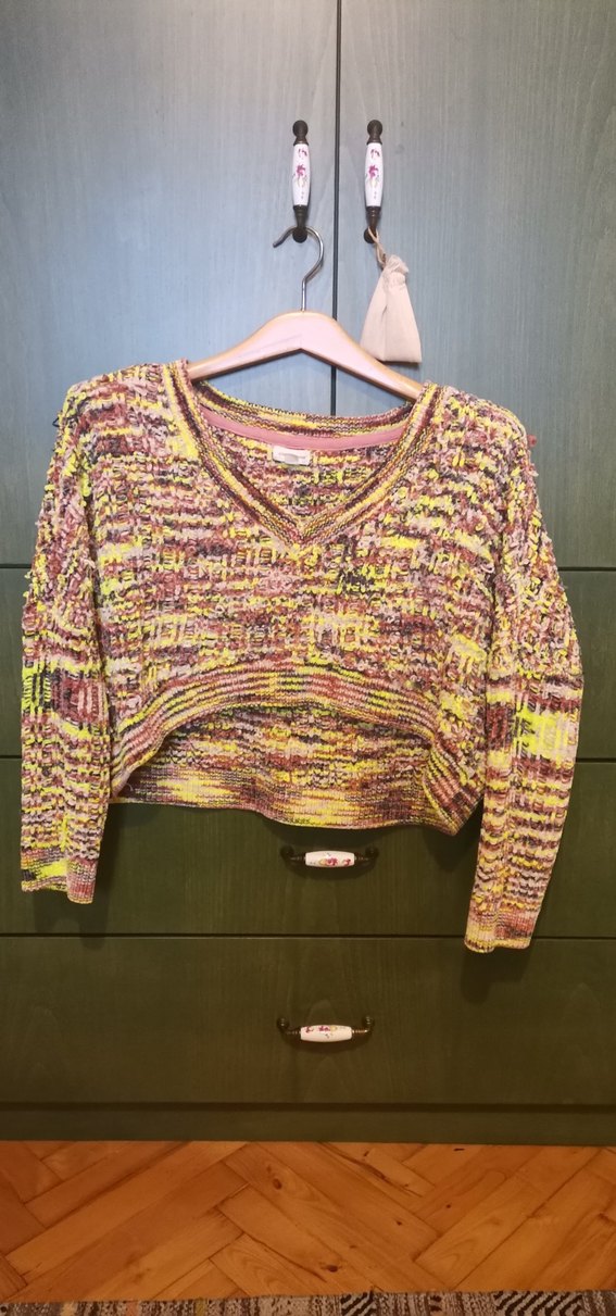 Renkli V Yakalı Bohem Crop Triko Kazak