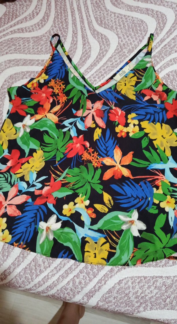 Renkli baskılı, V yakalı ve fırfırlı detaylı kolsuz bluz. Bol kesim ve kısa boyda, bohem tarz için uygun.