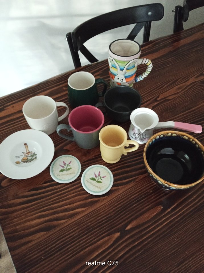 Farklı boyutlarda renkli ve desenli fincanlar ile tabaklar, tavşan desenli kupa ve küçük çiçekli bardak altlıkları içerir. ☕