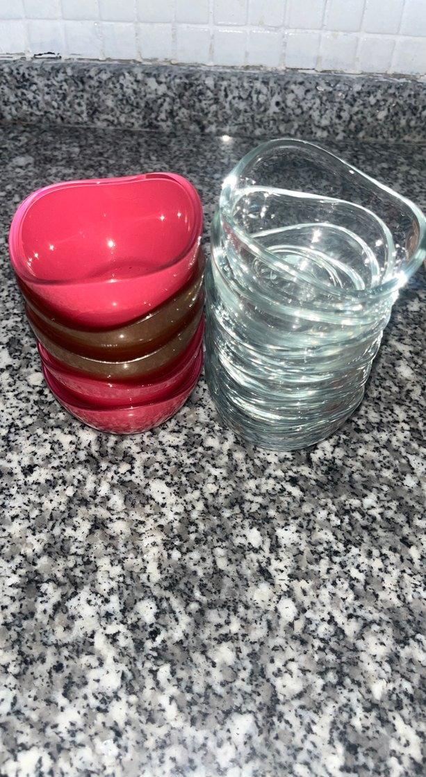 Koyu pembe ve şeffaf renklerde üst üste konulabilen kahve yanı sunumluklar