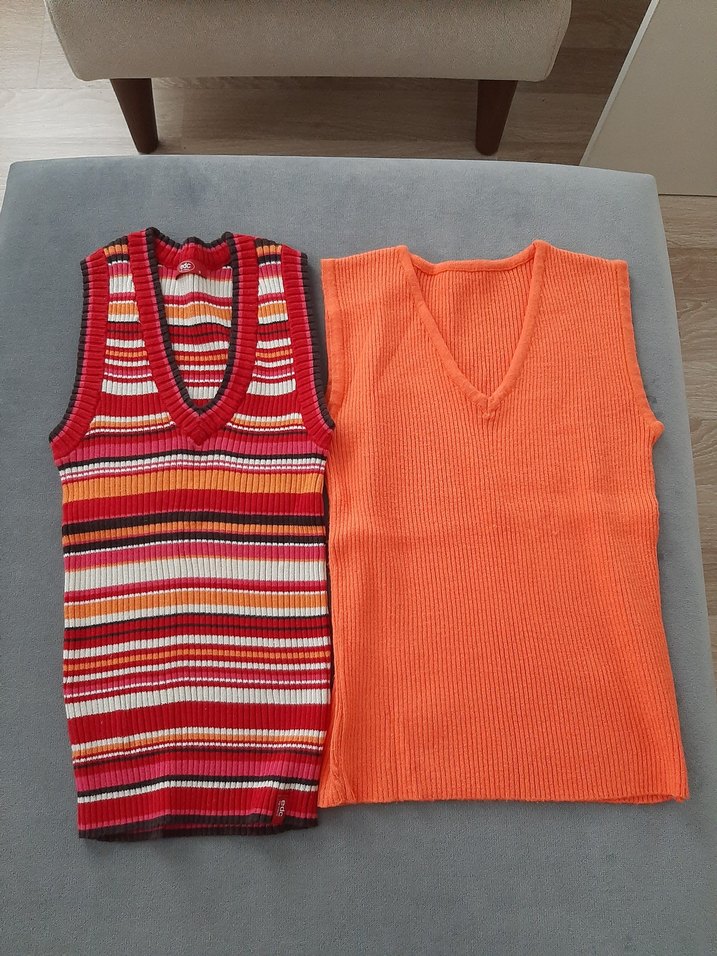 çizgili s beden ışıktan rengi biraz farkli görünüyor esprit marka.turuncu m beden farkli marka son fotoda minik 2 tane tüy görünüyor ikiside iyi durumda yurtdisi ürünü iade yoktur