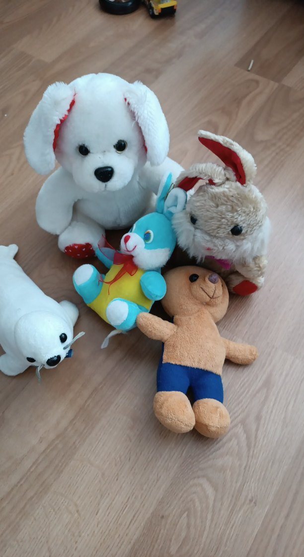 Beyaz köpek, tavşan, fok, mavi tavşan ve ayıcık içeren renkli ve yumuşak peluş oyuncak seti.