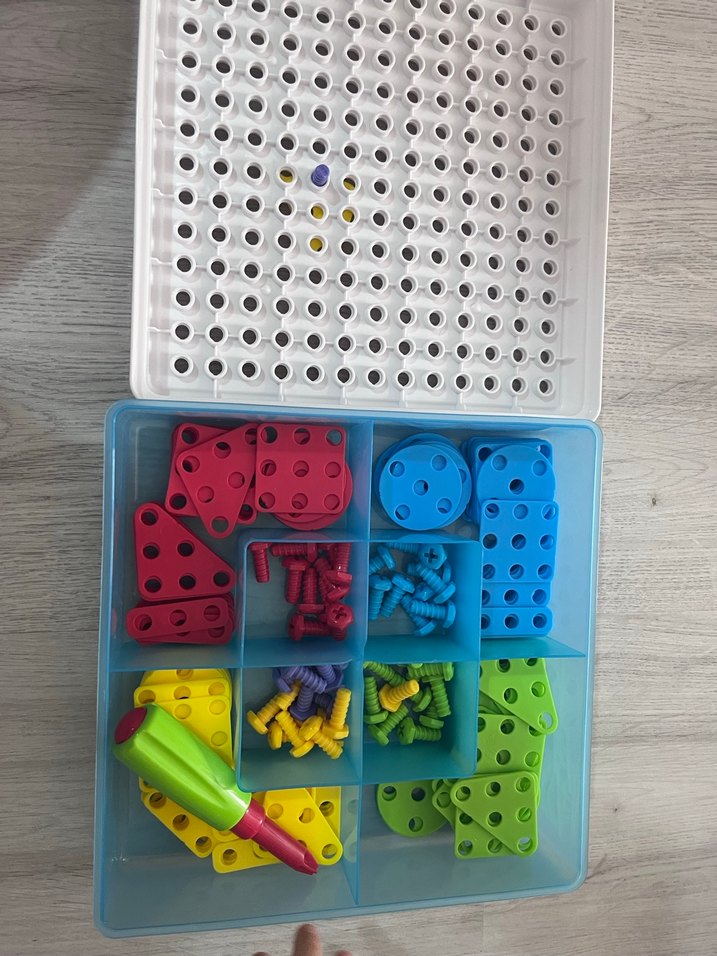 Çok renkli, farklı şekillerde vidalı parçalar ve pegboard içeren eğitim oyuncağı seti.