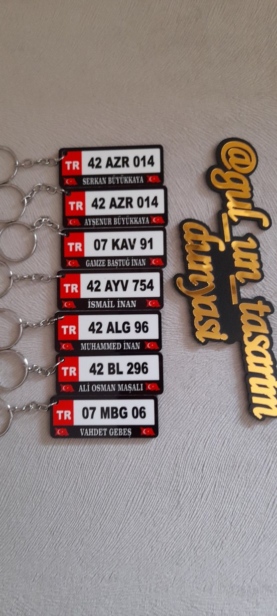 Altın renkli zincirli, renkli vintage Türk plaka şeklinde kişiselleştirilmiş isim ve numaralı anahtarlıklar seti. ️
