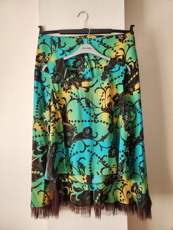 Su yeşili, kahve ve sarı tonlarından oluşan, vintage, desenli, etek ve askılıdan oluşan büyük beden şık takım.