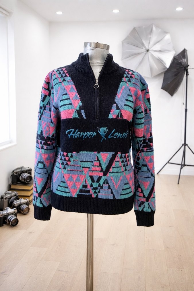 Renkli yün örgü kazak, yüksek yakalı fermuarlı, uzun kollu ve bol kesimdir. Geometrik baskılı, rahat ve günlük kullanıma uygundur. Bohem ve retro tarzda.