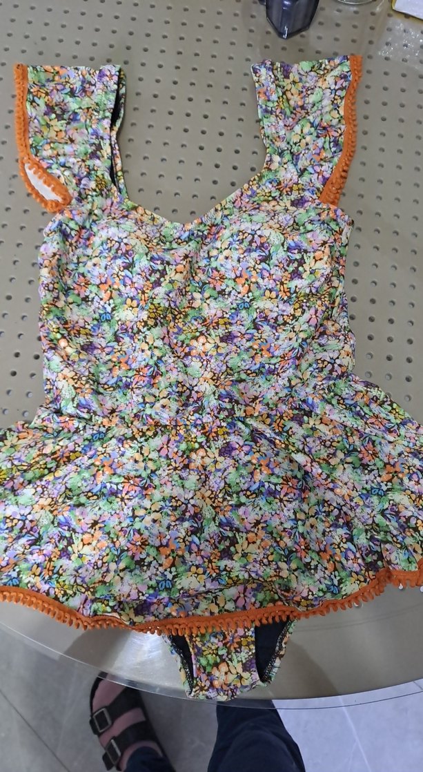 Renkli çiçek desenli, volan detaylı ve turuncu şeritli, kısa kesim bohem tarzda, kolsuz kadın mayo.