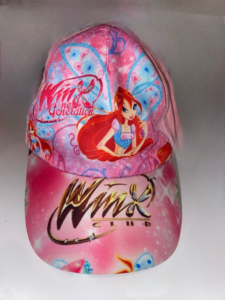 Sentetik kumaştan, renkli Winx baskılı, tokalı çocuk şapkası. Canlı ve pop kültür tarzında tasarlanmıştır.