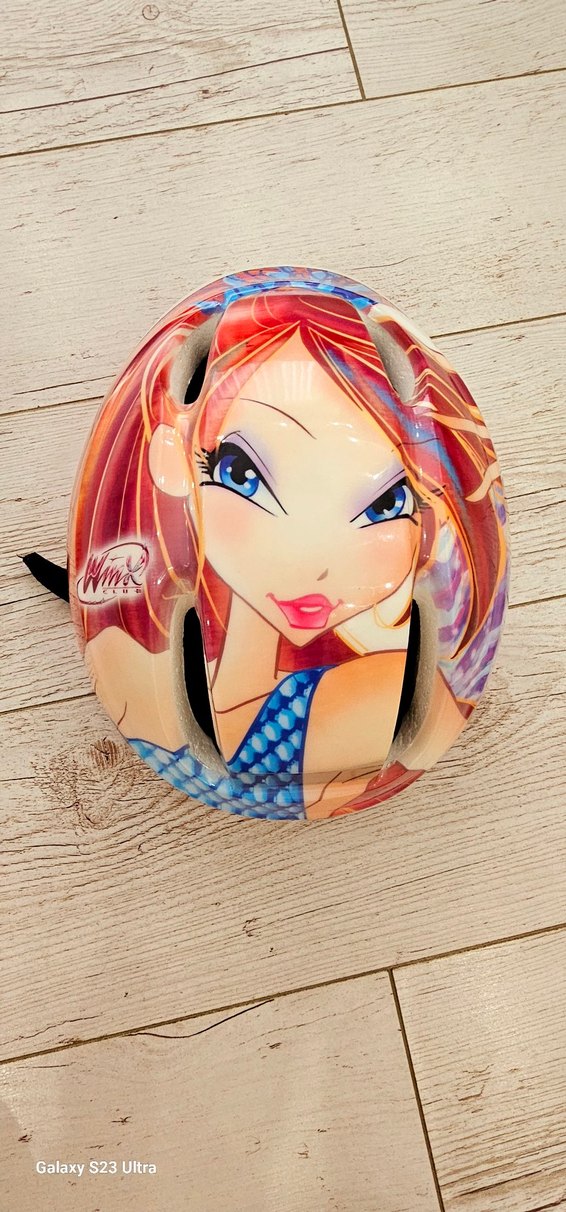 Renkli Winx Club karakterli çocuk kaskı, canlı ve dikkat çekici tasarıma sahip.