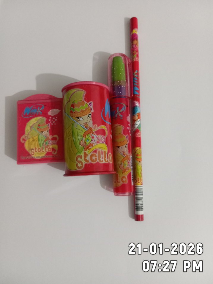 Renkli Winx temalı kalem, kalemtıraş, silgi ve yapıştırıcıdan oluşan set. Pembe ve canlı renklerde çizgi karakterli tasarımlar içerir.