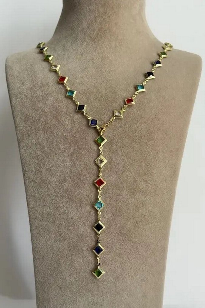 Renkli yılan desenli taşlar ve zincir detaylarıyla uzun bohem tarzda kolye, günlük kullanım için uygundur.