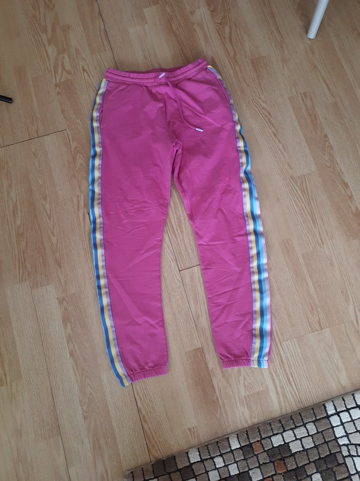 Rahat kesim, elastik bel ve renkli yan şeritlere sahip pembe kadın eşofman altı. Sentetik kumaştan, dış mekan sokak stili için uygun.