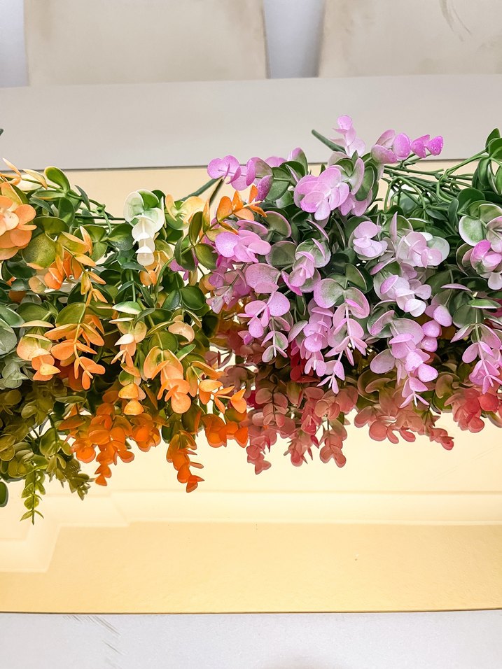 Turuncu, pembe ve yeşilin canlı tonlarında renkli yapay çiçek dekorasyonu, ev dekorasyonu için uygundur.