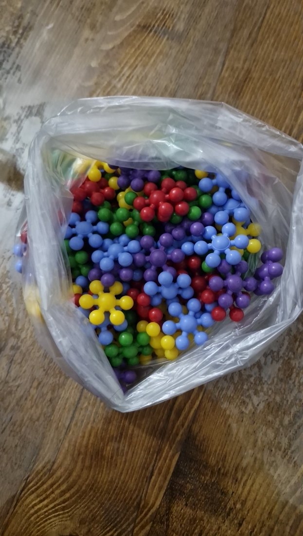 Çeşitli şekil ve canlı renklere sahip, plastik torbada saklanan renkli yapboz oyuncak seti.
