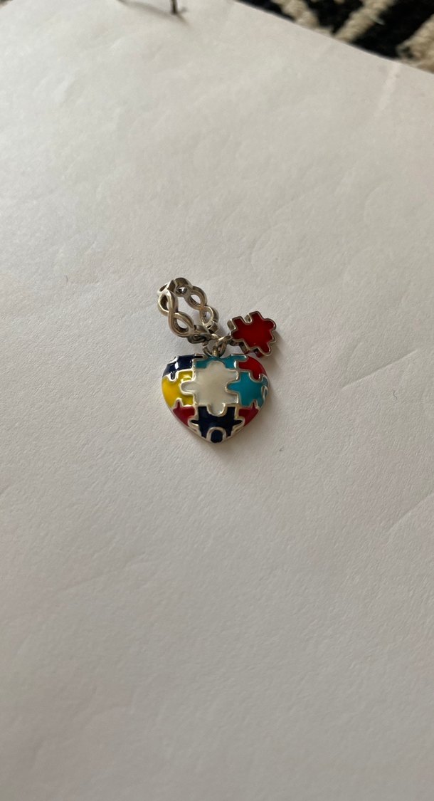 Boncuklu detaylara sahip, yapboz parçası desenli renkli kalp şeklinde kadın charm.