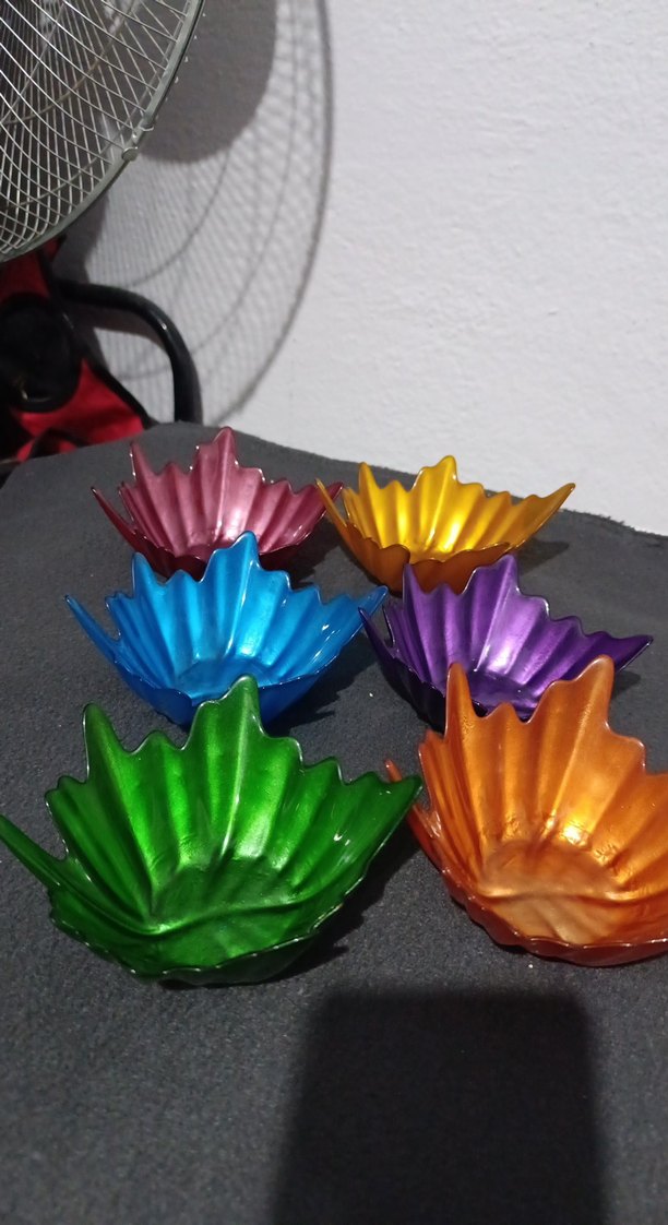 Yeşil, mavi, mor, turuncu, sarı ve pembe renklerde yaprak şeklinde dekoratif kaselerden oluşan set.