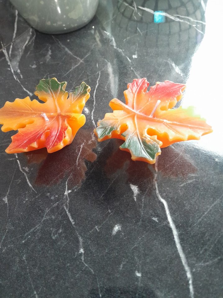 Canlı sonbahar renklerinde, yaprak şeklinde renkli mumlar, dekoratif kullanım için idealdir.