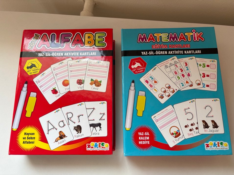 Yaz-sil özelliğiyle renkli alfabe ve matematik eğitim kartları. ✏️