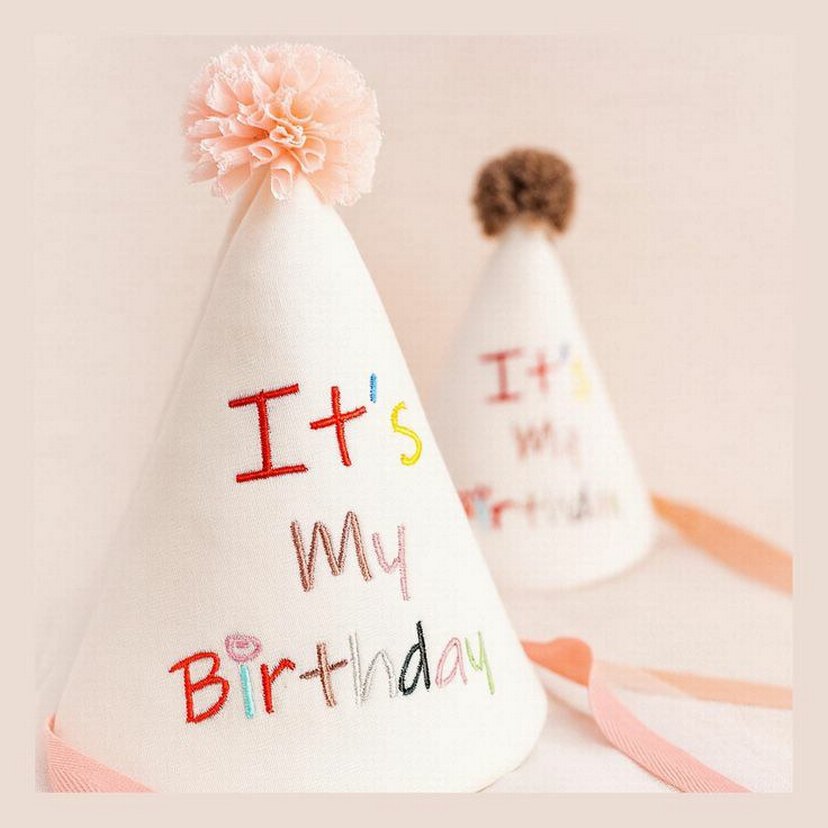 Üstünde renkli "It's My Birthday" yazısı ve yumuşak ponpon bulunan beyaz doğum günü parti şapkası.