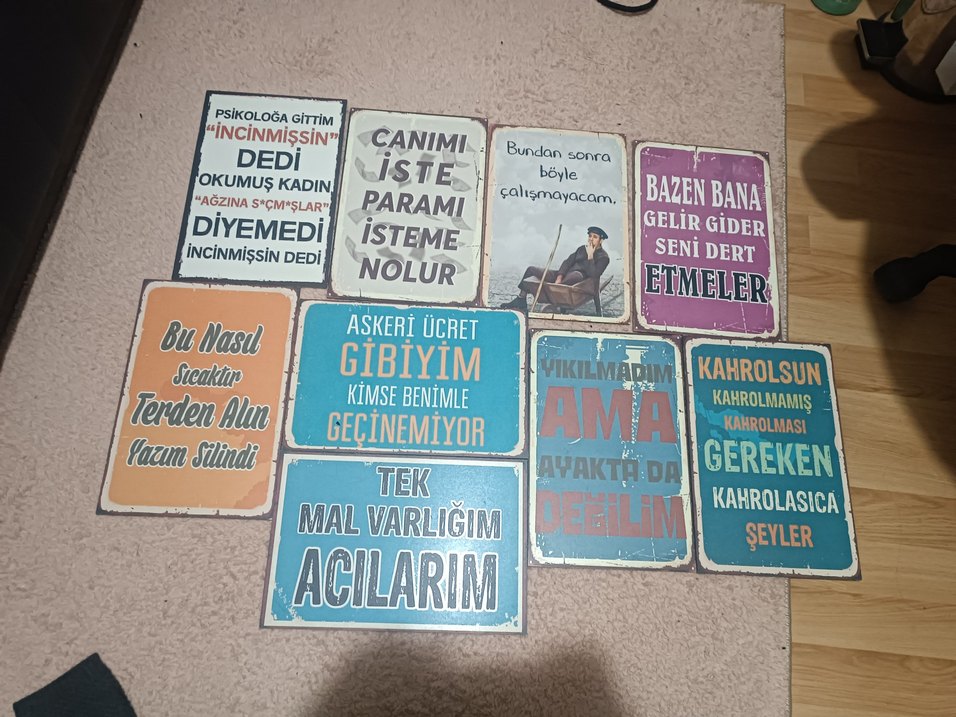 Duygu ve düşünceleri ifade eden çeşitli Türkçe yazılı renkli metal dekoratif tablolar seti. Canlı renkler ve vintage tarzı yazı karakterleri içerir.